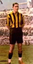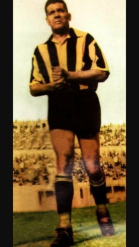Se recuerda que en 1911, en un partido ante la selección argentina, Piendibene, por dos veces, dribleó la defensa adversaria, a la carrera, mediante sus amagues precisos y elegantes, debidos a su elasticidad y visión del juego. La aludida zaga la formaban dos notables jugadores: los hermanos Juan y Jorge Brown. Justamente éste, con espontaneidad, admirando el arte de aquellas jugadas que terminaron en goles contra su valla, le abrazó diciéndole: "lo felicito; es usted un verdadero maestro". Desde entonces, y para toda la afición, Piendibene fue el "maestro", el astro máximo de nuestro fútbol. Volver al principio JOHN HARLEY: EL TECNICISMO John Harley, el famoso centro-half fue descubierto por Piendibene. Hallándose éste en pleno encuentro de Peñarol con Ferrocarril Oeste de Argentina, y apreciando la facilidad y eficiencia con que Harley pasaba la pelota dominada a sus compañeros de ataque, hizo que Piendibene sugiriese le invitaran a que por unos meses jugara con los aurinegros. John Harley, nacido en Glasgow en 1886, tenía apenas 20 años cuando embarcó hacia Buenos Aires, contratado por la empresa del Ferro Carril Oeste y defendió los colores del club de Caballito. En 1909 aceptó venirse a Montevideo, a trabajar en el ferrocarril y jugar fútbol, por unos meses: se quedó para siempre! Desde filas aurinegras, Harley proporcionó el arte futbolístico de su país para mejorar el nuestro. Aumentó la enseñanza, jugando la pelota a ras del suelo y aplicando el pase certero, evitando el "bombazo" -tan de moda últimamente en el fútbol uruguayo-. Volver al principio ISABELINO GRADIN: EL VELOCISTA Isabelino Gradin debutó en Peñarol en 1915 cuando también irrumpía Antonio Campolo, poco después Roberto Chery. Isabelino se constituyó en el forward de arranque extraordinario, dribleador casi imparable, a la vez con llamativo sentido para el gol. Era volocísimo y llevaba la pelota como pegada a los zapatos; sus esquives le hacían incontenible. Contaba con el apoyo de Piendibene, quien al verle en marcha exclamaba: "¡Entrá Isabelino!...", y el moreno invadía el área como un émbolo; casi al unísono la pelota sacudía la red.